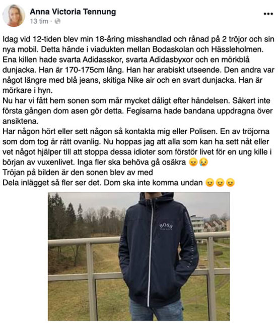 I ett inlägg på Facebook, som i skrivande stund delats över 2000 gånger, skriver en kvinna att hennes 18-årige son misshandlats och rånats på två tröjor och sin nya mobiltelefon. Allmänheten uppmanas att dela inlägget, som kan nås här.