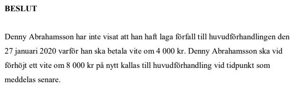 Trots intygen, bilderna samt blodproven har domstolen i ett särskilt beslut underkänt dokumentationen. Till sin hjälp har man tagit ett expertråd från Socialstyrelsen. Enligt beslutet som Samhällsnytt har tagit del av beläggs pensionären med ett vite på fyra tusen kronor för att ha missat rättegången utan ”laga förfall” – det vill säga utan en legitim anledning till det. Därtill kommer han att tvingas att betala 8 tusen kronor om han inte infinner sig vid nästa datum – någon gång i februari: