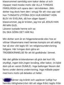 Igår publicerade Roteliuc ett inlägg på Facebook i vilket hon skriver att eleverna var tvungna att i ett brev bekänna islamsk tro och delta i en bön samtidigt som böneutrop spelades i klassrummet. Vidare ska barnen ha varit tvungna att färglägga en moské på ett A4-papper.