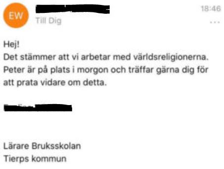 Janouch frågar Roteliuc om lärarna har muslimsk bakgrund men så inte är fallet. Hon har kontaktat skolans rektor och ännu enbart fått ett svar från läraren i fråga som erkänner att de arbetar med världsreligionerna.