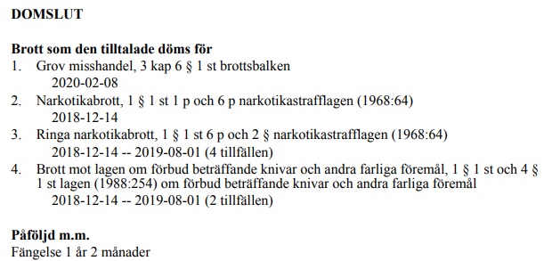 Abdalraouf Al Far döms nu för grov misshandel, narkotikabrott, ringa narkotikabrott och brott mot knivlagen. Den grova misshandeln är det allvarligaste brottet där påföljden är angiven till fängelse lägst ett år och sex månader.
