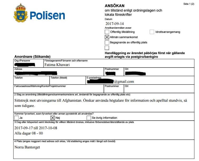 I morse har talespersonen för den pågående afghanska demonstrationen på Norra Bantorget i Stockholm, Fatemeh Khawiri, ansökt om ett nytt demonstrationstillstånd hos polisen. Det nuvarande tillståndet löper ut kl. 22 den 17 september. Gruppchefen för rättsavdelningen vid polisen i Stockholm, Björn Knutsson, skrev i ett mejlsvar till Samhällsnytt att det inte blir något beslut idag utan att ärendet kommer att hanteras på måndag.