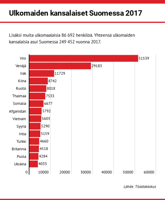I nedanstående grafik från Ilta-Sanomat sammanställs utländska medborgare i Finland. De två största grupperna är viro som betyder ester och veneäja som betyder ryssar.