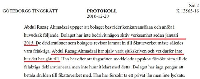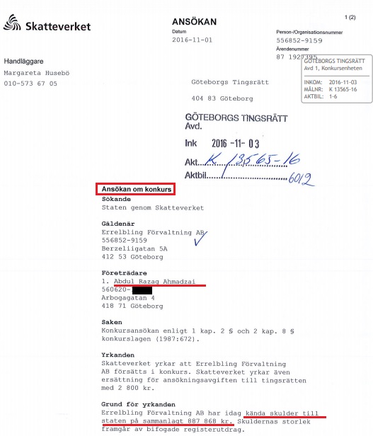 I ansökan om konkurs som följer nedan framgår det att paret Ahmadzai år 2016 hade kända skulder till staten på 887 868 kronor. Det handlar bland annat om skatteskulder och banklån som paret har struntat i att betala.
