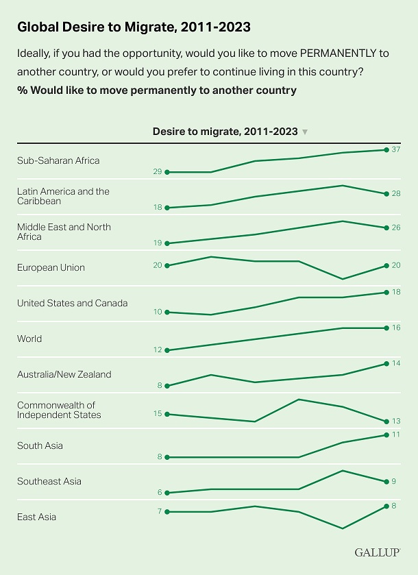 2023 uppgav 16 procent av vuxna, omkring 900 miljoner personer, att de ville lämna sitt hemland permanent om de kunde. Jämfört med 2022 och 2021 är siffran oförändrad. Under åren 2011-2018 låg motsvarande siffra på 12-15 procent.