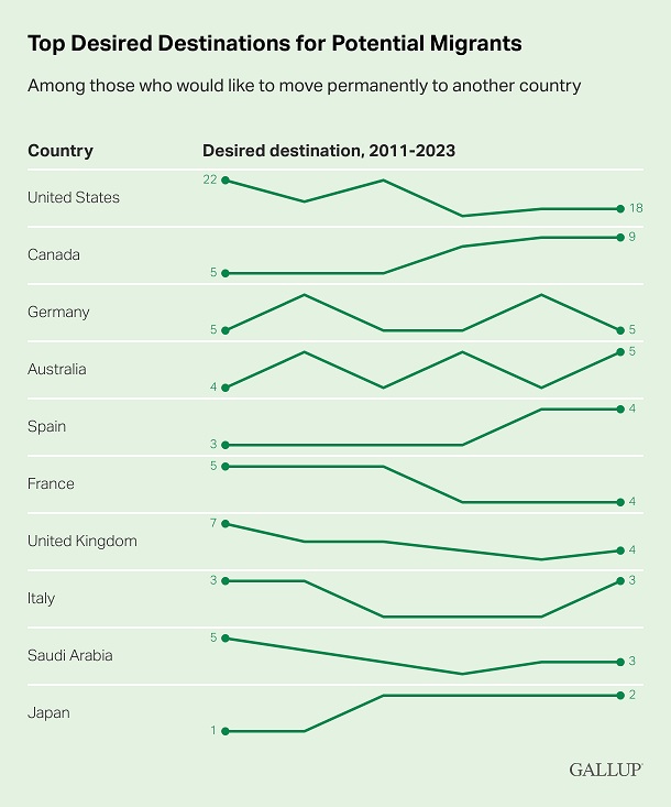 Något som kanske förvånar är att det i länder som många vill migrera till också finns en betydande andel som vill lämna, som USA och Kanada där ett rekordstort antal vill utvandra.