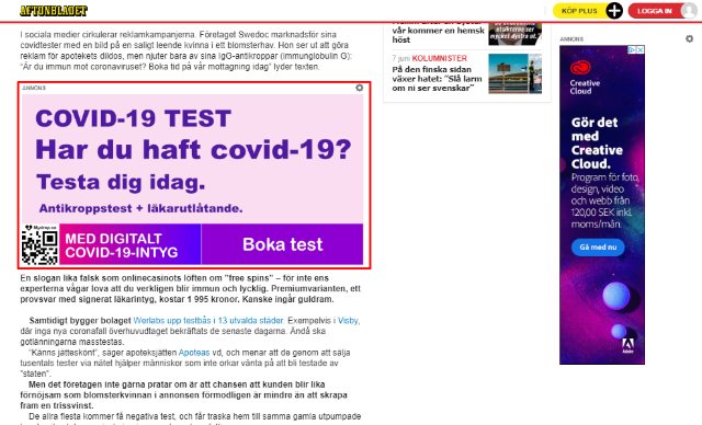 Aftonbladet beklagar sig över annonser för Covid-tester – har själv reklam för sådana tester