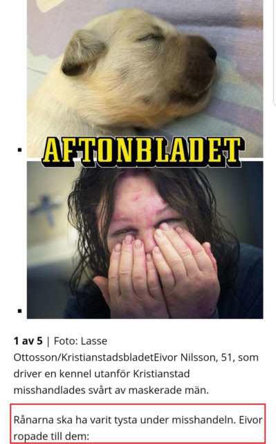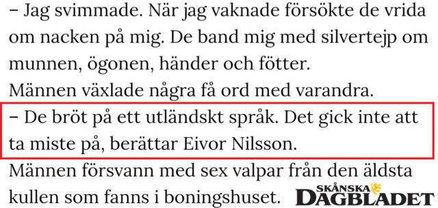 Tidigare i veckan blev Eivor, 51, brutalt misshandlad i samband med att tre maskerade män rånade henne på sex hundvalpar. Trots att hon har återberättat för lokal media att ”De bröt på ett utländskt språk. Det gick inte att ta miste på” väljer Aftonbladet att helt utelämna ursprung. Sedan skriver tidningen, ”Rånarna ska ha varit tysta”. Samhällsnytt har kontaktat Eivor för att se vad som stämmer.