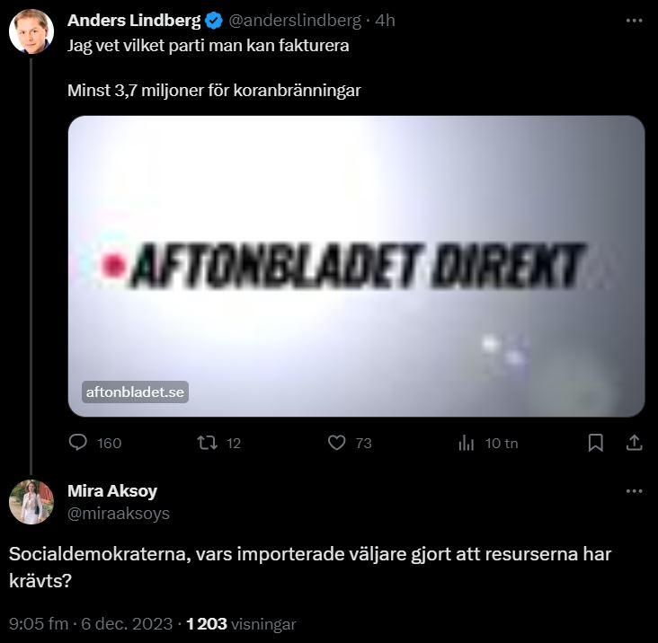 Enligt Sveriges Radio kostade Salwan Momika koranbränningar knappt fyra miljoner kronor för polisens bevakning. Det anser Aftonbladets politiska chefredaktör Anders Lindberg att Sverigedemokraterna ska betala.