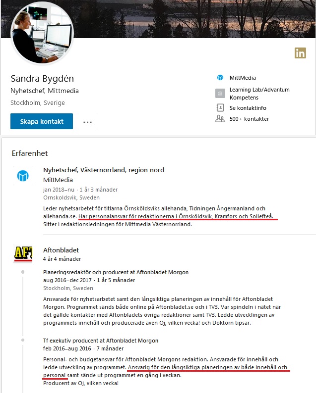 Jag tittade på ditt cv på LinkedIn och du fick ju jobb både på Aftonbladet och i Mittmedia. Det sammanfaller med att du blev sambo med Sandra Bygdén som befann sig på chefspositioner i de båda tidningarna. Hur kom det sig?