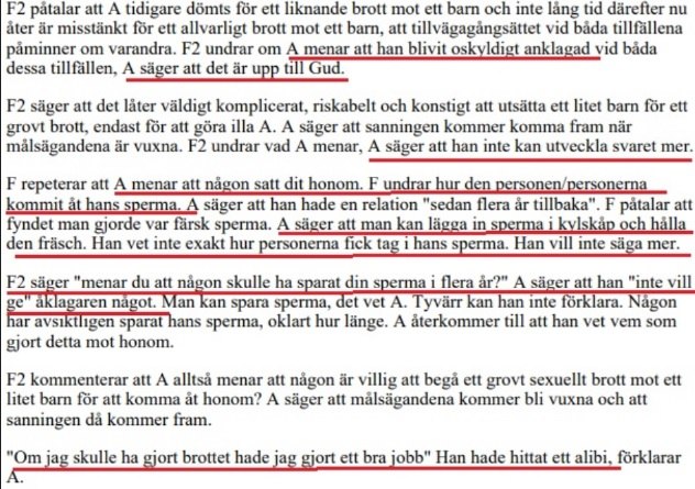 När förhörsledare frågar om Ahmeds sperma på flickans kropp svarar han att det är någon som har hans sperma. Han vill däremot inte berätta hur det kan ha gått till att någon fått tag på hans sperna, eftersom han inte vill ge åklagaren någonting. Men han försäkrar poliserna ”att man kan lägga in sperma i kylskåp och hålla den fräsch”.