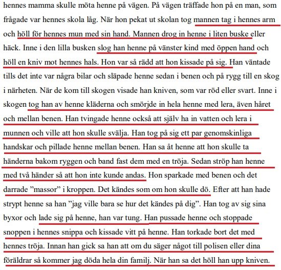 I polisförhör berättar flickan hur kidnappningen och våldtäkten gick till. Hon återberättar hur hennes kropp darrade och hon trodde att det var slutet på hennes liv.