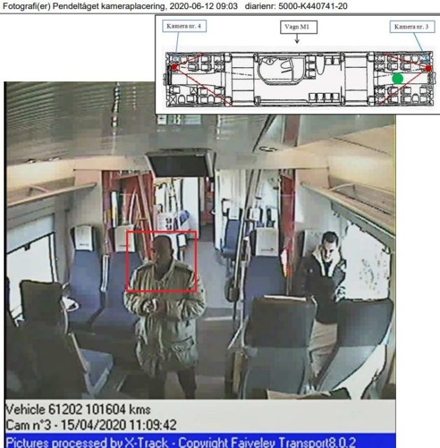 Efter larmet drog polisen igång en större insats där man kontrollerade lokaltrafiken i närområdet. I samband med det fick poliser syn på en man som stämde in på det signalement som flickan hade lämnat. Nedan syns tågvagnen övervakningskamera fånga Ahmed med lera på kläderna.