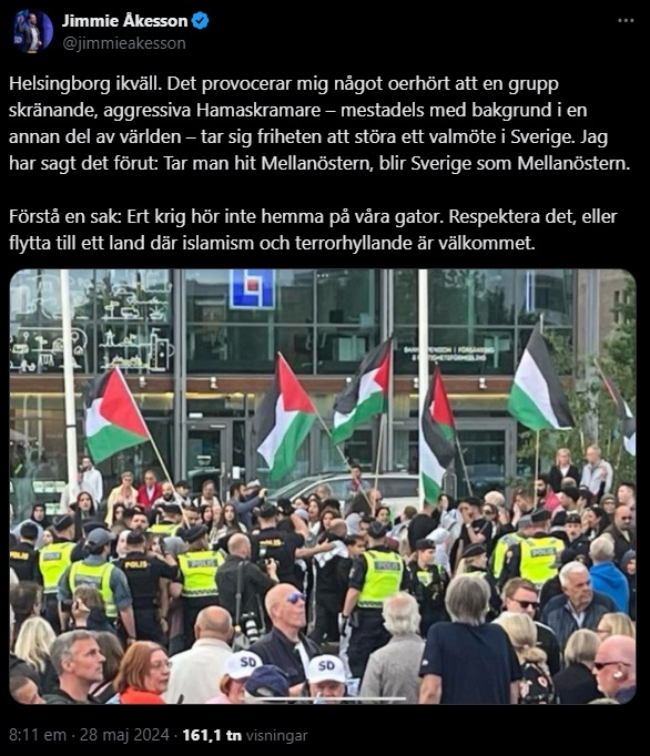 På tisdagskvällen höll SD-ledaren Jimmie Åkesson en EU-valskampanj i centrala Helsingborg där även pro-palestinska demonstranter dök upp för att skandera burop och slagord. SD-ledaren kallade demonstranterna ”Hamaskramare” och framförde att deras krig inte hör hemma i Sverige.