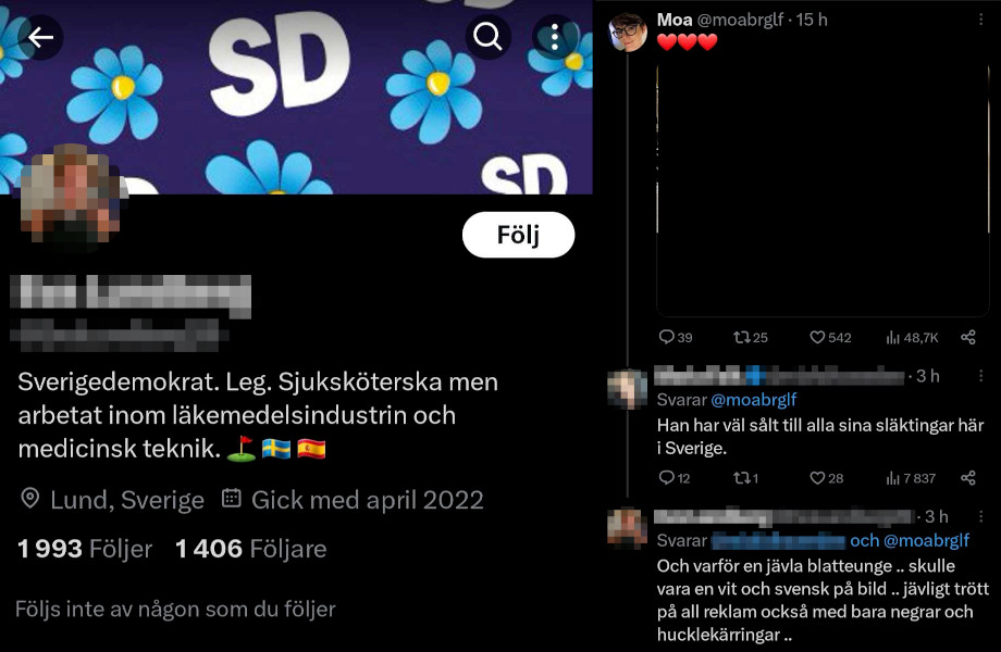 “Och varför en jävla blatteunge.. skulle vara en vit och svensk på bild.. jävligt trött på all reklam också med bara negrar och hucklekärringar..”, skriver hon på det sociala mediet X.