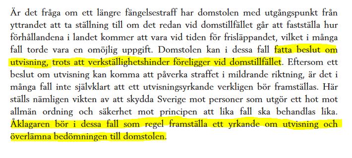 I Åklagarmyndighetens Rättslig promemoria 2013:5 ”Utvisning på grund av brott” står dock uttryckligen att i fall som gäller längre fängelsestraff och personer som utgör ett hot mot allmän ordning och säkerhet i Sverige bör åklagaren framställa ett yrkande om utvisning och överlämna bedömningen till domstolen – istället för att bedöma själv.