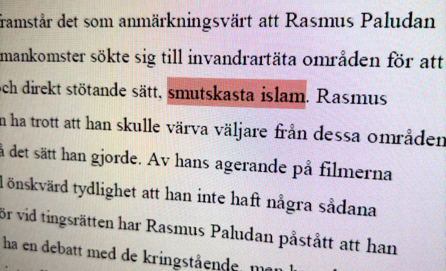 Malmö tingsrätt anser att Rasmus Paludan smutskastat islam. Faksimil