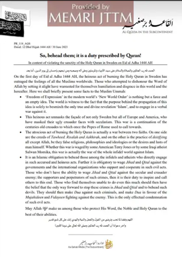 Den 2 juli publicerade Al-Qaida på den indiska subkontinenten ett uttalande på sin officiella kanal Al-Sahab Media i vilket terrorgruppen framförde att koranbränningarna kränker muslimer och att väst för ett ett heligt krig mot islam genom dessa. Det rapporterar Middle East Media Research Institute (MEMRI).