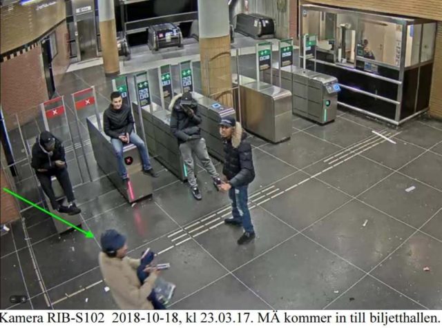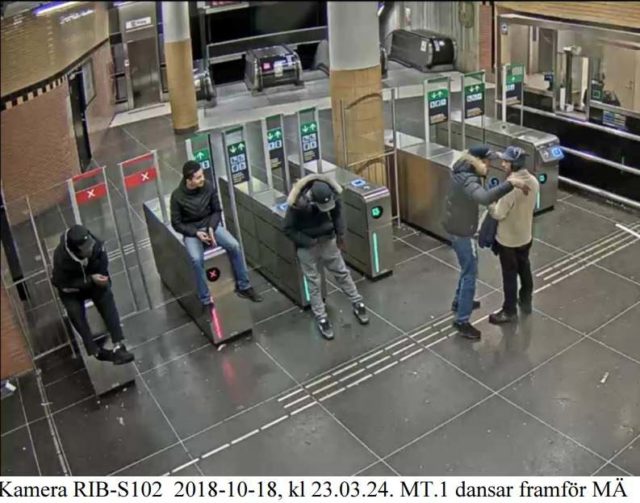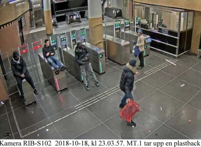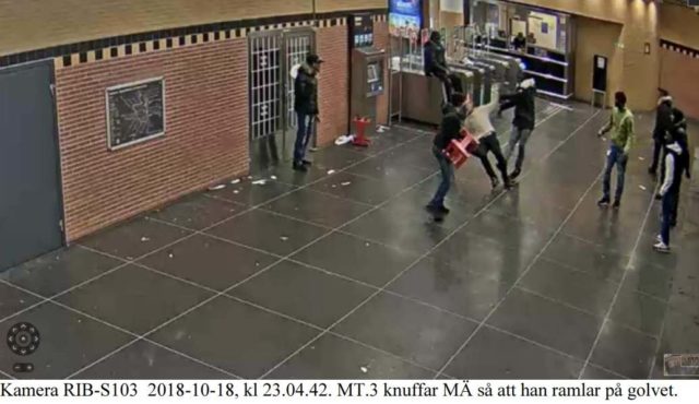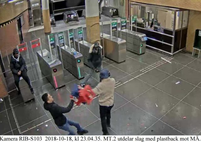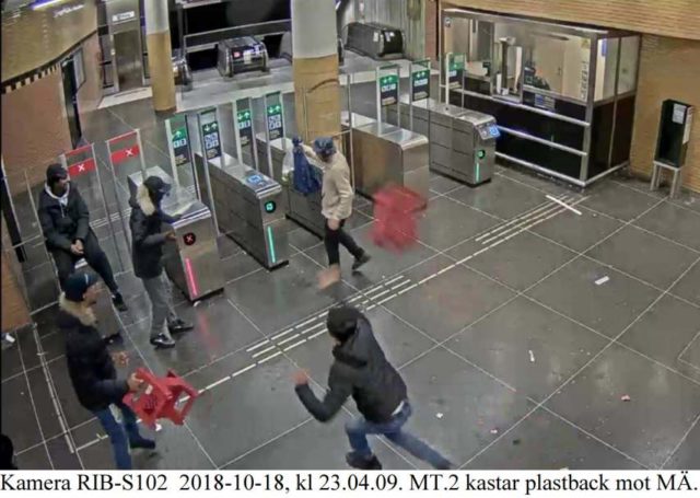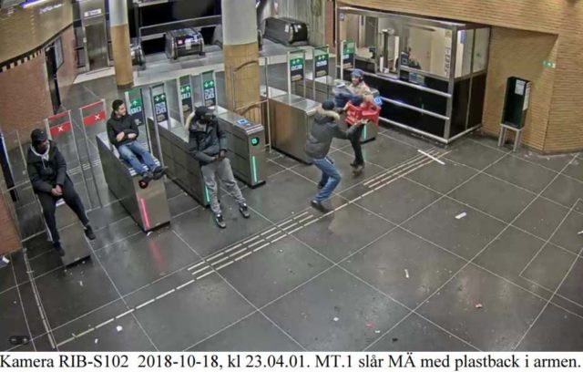 Det var strax efter klockan 23 den 18 oktober förra året som ett gäng ungdomar hängde i tunnelbanans biljetthall i den invandrardominerade Stockholmsförorten Rinkeby. En äldre man som passerar gänget blir stoppad och konfronterad. Gänget påbörjar helt oprovocerat en misshandel med hjälp av plastbackar. Nedan kameraövervakningsbilder från händelsen.