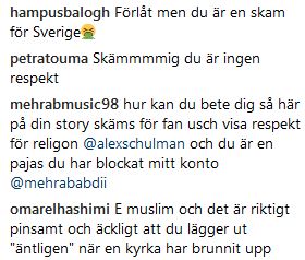 Bilden med det provocerande budskapet lades upp på Instagrams händelser där det inte går att kommentera. Kommentarerna återfinns i de senaste inläggen av Schulman – som är en betald reklam för matleverantören Mat.se. Inläggen fylldes med hatiska budskap mot Schulman samt uppmaningar att anmäla hans konto till Instagram.