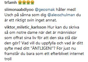Medan den franska katedralen stod i lågor och människor över hela världen sörjde förlusten av det kulturella och historiska arvet tog det inte lång tid för vissa representanter av Sveriges kulturelit att reagera på branden. Vid midnatt igår när elden fortfarande härjade i Notre Dame lade Alex Schulman upp en bild på den brinnande kyrkan med ordet ”Äntligen” på sitt Instagram.