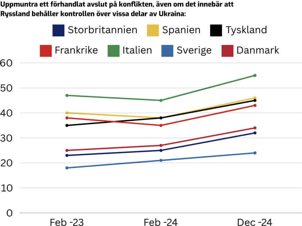 I länder som Tyskland och Spanien är det numera nästan dubbelt så många som vill förhandla istället för att skicka allt mer vapen. I början av 2023 var det istället en majoritet i dessa två länder som ville fortsätta stödet.