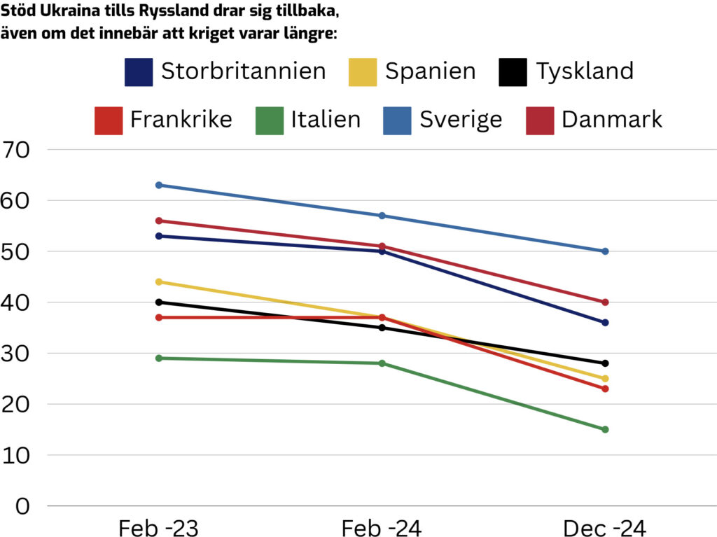 Stödet bland svenskarna för den ukrainska saken minskar emellertid. I februari förra året ville så mycket som 63 procent av svenskarna fortsätta skicka pengar och vapen, medan endast 18 procent ville förhandla.