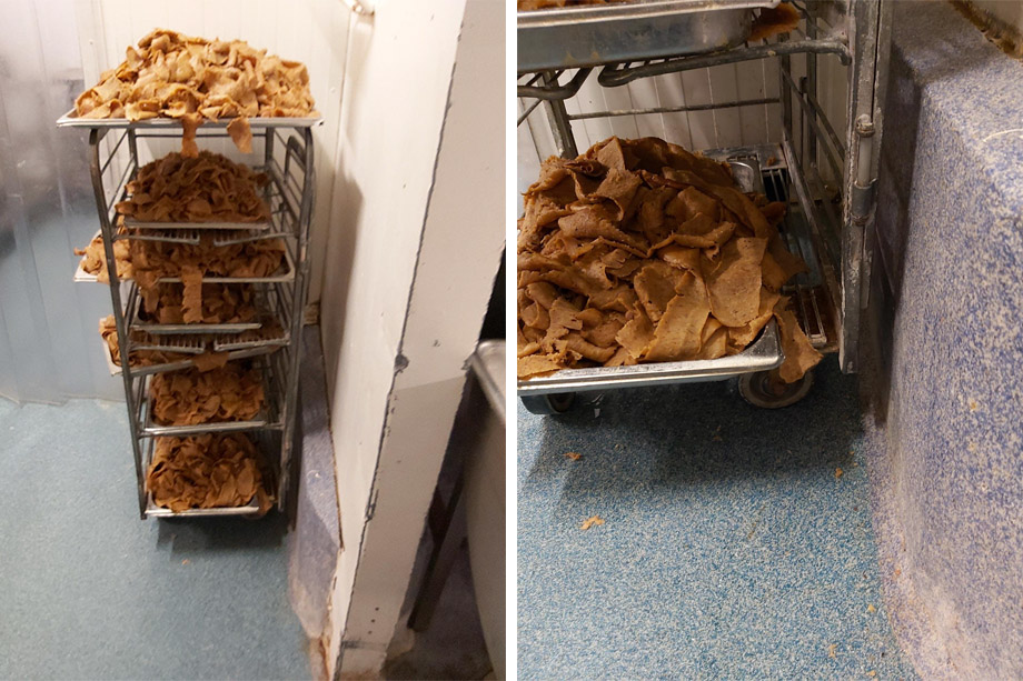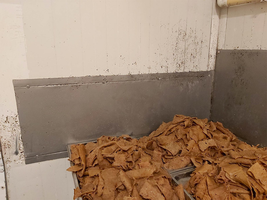 I en kyl ligger skivad kebab öppet och hänger ned från stora brickor, och köttet kommer på så sätt i kontakt med såväl väggar som golv. På både brickor som kebabköttet ligger på, och på väggarna, finns gamla fettrester som det växer mögel i.