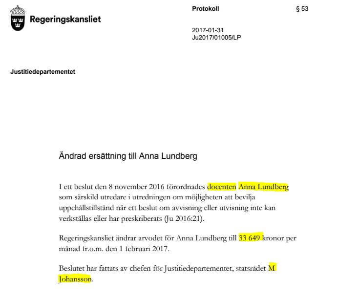 Genom ett särskilt beslut av Justitiedepartementets chef Morgan Johansson tilldelades Lundberg ett arvode på 24 tusen kronor per månad som i februari 2017 höjdes till 33.649 kronor. Sammanlagt fick hon 374.913 kronor för sitt uppdrag: