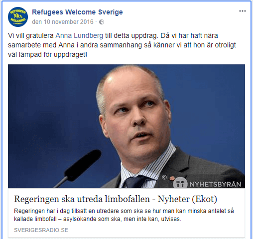 Tidigare idag kunde Samhällsnytt berätta om att den statliga utredaren bakom förslaget om att ge uppehållstillstånd till asylsökande med avslag som inte går att utvisa till sina hemländer, är aktiv inom Asylgruppen i Malmö. Redan i rollen som särskild regeringsutredare fortsatte hon att marknadsföra gruppen genom sitt konto på Facebook: