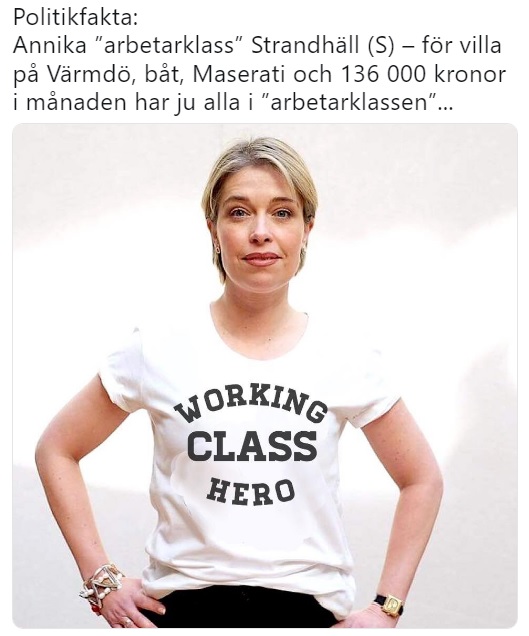 Arbetarklass Det är inte första gången som den kontroversiella ministern hamnar i blåsväder i sociala medier. Tidigare har hon uppmärksammats för att kalla sig ”arbetarklassens hjälte”. Strandhäll målar gärna upp bilden att hon är en del av arbetarklassen och det mångkulturella Sverige – trots att hon bor på Värmdö i Stockholms inre skärgård och tjänar 136 000 kronor per månad.