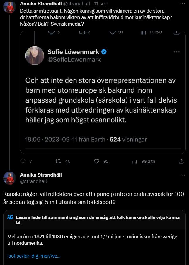 Före detta miljö- och klimatminister Annika Strandhäll (S) väckte åter igen uppmärksamhet för några dagar sen då hon på X, tidigare Twitter, hävdade att ett förbud mot kusinäktenskap som regeringen och SD tagit initiativ till är ”en genuin skitfråga”. I samband med utspelet gjorde S-toppen även andra märkliga påståenden som sedermera rättats av andra användare på plattformen.