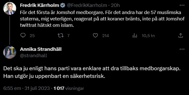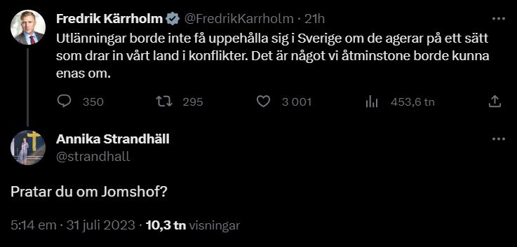 Det var som ett svar på moderaten Fredrik Kärrholms inlägg, om utlänningar som drar in Sverige i konflikter, Strandhäll drog in Richard Jomshof (SD) i det hela.