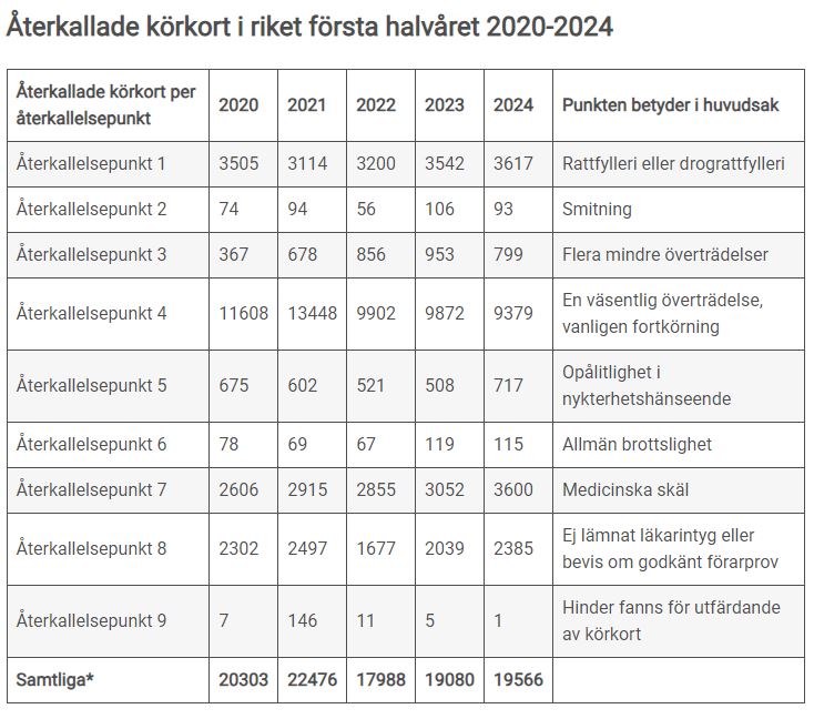 Uppgången jämfört med första halvåret 2023 ligger på 2,6 procent. Den vanligaste orsaken till en körkortsåterkallelse är ett väsentligt trafikbrott, vanligtvis en hastighetsöverträdelse. Återkallelser i just denna kategori minskade dock.