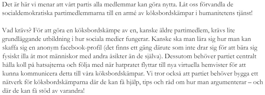 ”För att göra en köksbordskämpe av en, kanske äldre partimedlem, krävs lite grundläggande utbildning i hur sociala medier fungerar. Kanske ska man lära sig hur man kan skaffa sig en anonym facebook-profil”, föreslogs det.