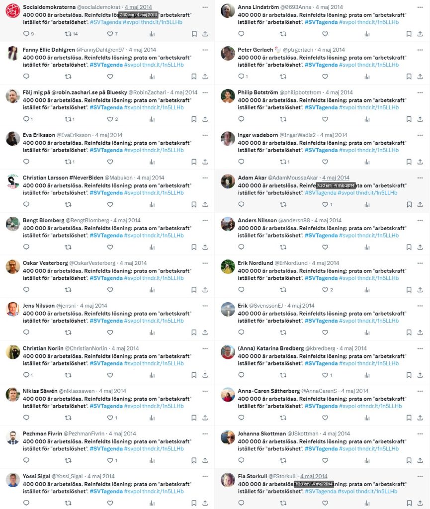Samtidigt, exakt samma minut, twittras exakt samma inlägg ut från ett drygt 20-tal andra konton. Ett agerande som tyder på automatiserad spridning av ett politiskt budskap via ett stort antal konton. Något som kritiskt påpekades då, men Socialdemokraterna slapp medial skärskådning.
