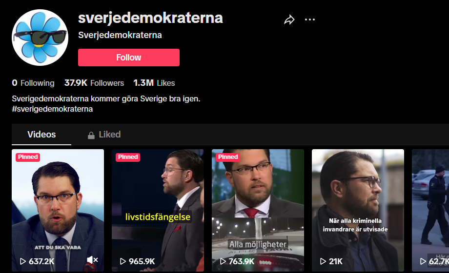 Två andra konton som det kanske inte heller är någon överrasking att just SD står bakom är ”Jimmiemoments” och ”Sverjedemokraterna”. Även de på Tiktok.