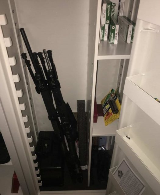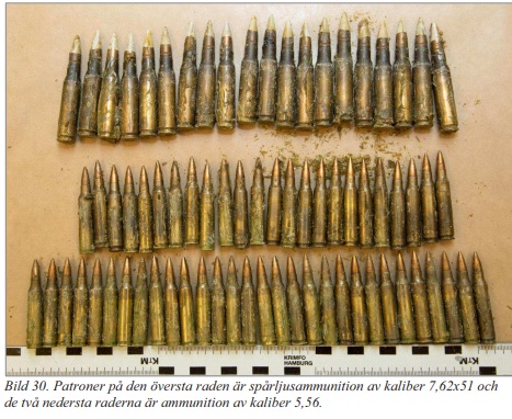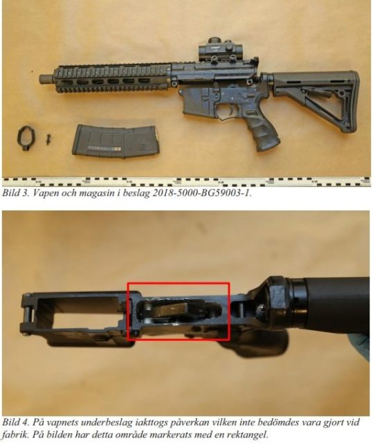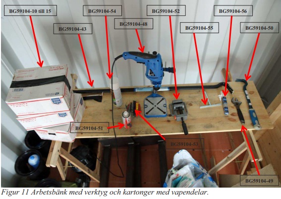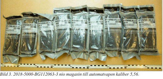 De vapendelar som påträffades kan sättas samman till ytterligare fyra stycken kompletta halvautomatiska gevär av typen AR-15. Man påträffade även magasin med helmantlad ammunition som enligt polisen är avsedd att ge livshotande eller dödliga skador. Vidare skriver polisen att ammunitionen har hög penetrationsförmåga och därmed utgör ett stort hot mot polispersonal som bär skyddsväst.