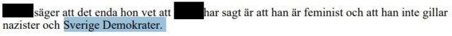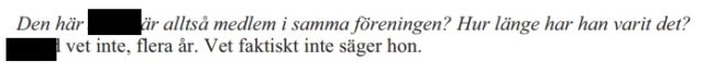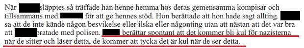 En detalj som framkommer är att kort innan vännerna kallas på förhör har ordföranden berättat för 42-åringens sambo ”att det kommer bli kul för nazisterna när de sitter och läser detta” och syftar troligen på vad som kommer diskuteras när förundersökningen blir offentlig.