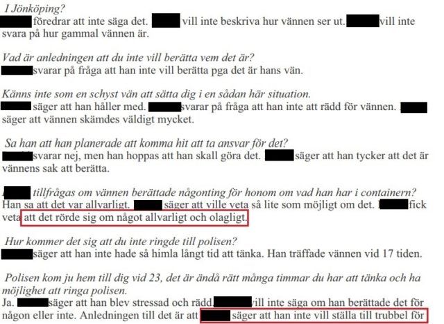 Personen som nyttjar containern är en god vän till honom och han vet att personen förvarar något allvarligt och olagligt i utrymmet. Han har däremot ingen aning om vad det är. Vidare vill han inte uppge vem personen är trots att han riskerar fängelse för den allvarliga brottsmisstanken. Anledningen till det uppges i förhöret vara att han ”inte vill ställa till trubbel”.