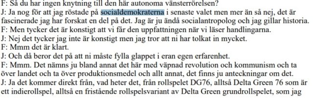 I ett annat förhör med ytterligare en bekant ber polisen om en uppfattning kring de politiska åsikter som personen som nyttjar containern innehar.