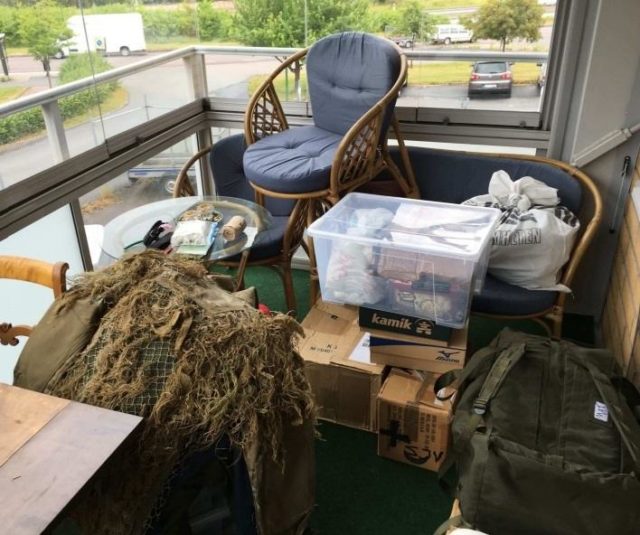 I lägenheten påträffar man stridsutrustning, mängder med vapenrepliker, en whiteboardtavla med planering, vänsterradikal litteratur, anteckningsblock fyllda med idéer om maktövertagande och listor med saker som ska införskaffas. I ett CV och genom lönespecifikationer kan man se att mannen har en gedigen bakgrund inom Försvarsmakten där han varit aktiv mellan år 2006 och 2017. Han har bland annat varit sjukvårdare i ett jägarförband.