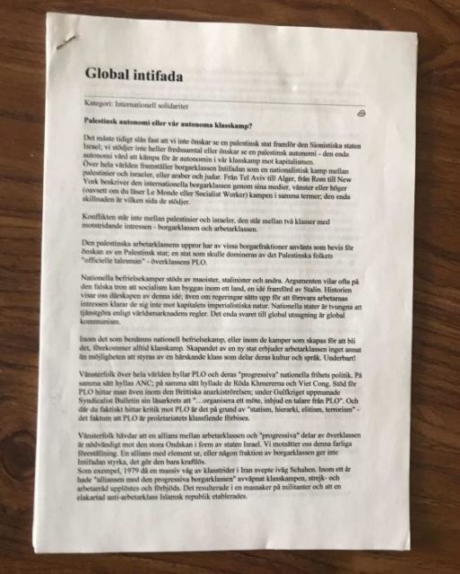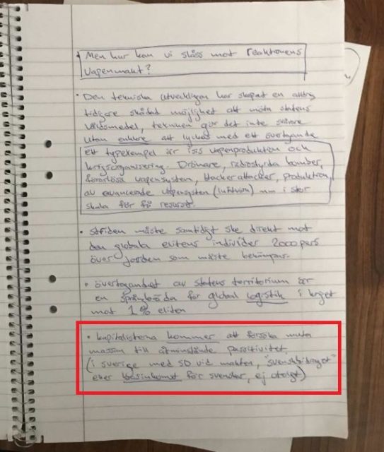 Bland alla ideologiska anteckningar rörande revolution nämns Sverigedemokraterna som ett parti som kommer att gå kapitalisternas ärenden när kriget har startat. Enligt texterna är det ”ej otroligt” att SD mutar svenskar till passivitet i kampen genom något som kallas ”svenskbidraget” eller ”basinkomst för svenskar” menar författaren.