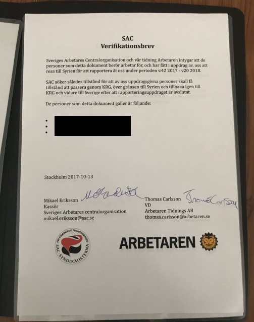 Av ett verifikationsbrev utfärdat av Sveriges arbetares centralorganisation (SAC) även kallad SAC Syndikalisterna, framgår att deras tidning Arbetaren har gett 32-åringen i uppdrag att resa till Syrien som reporter under perioden vecka 42 år 2017 till vecka 20 år 2018.