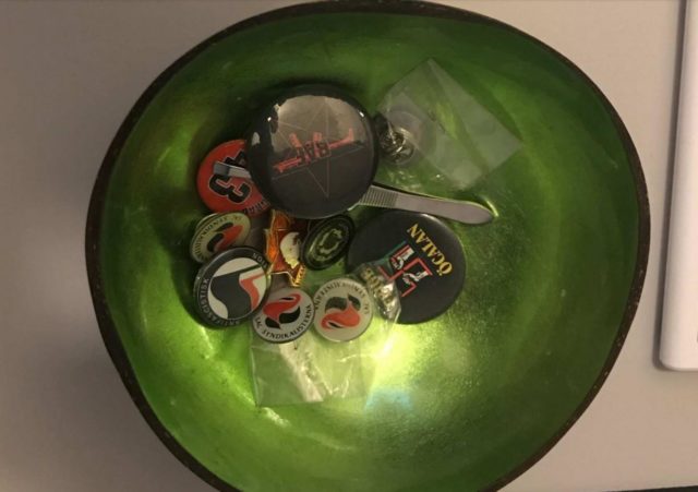 Ett flertal märken hittas, bland annat ett som visar ett automatvapen och texten RAF. Det är förkortning för Röda armé-fraktionen som även var känt som Baader-Meinhof-ligan, den mest aktiva av 1970-talets vänsterextrema terroristorganisationer. Bland märkena fanns också sådana för SAC Syndikalisterna och ett med texten ”Öcalan”, vilket hänvisar till terrorstämplade PKK:s tidigare ledare Abdullah Öcalan.