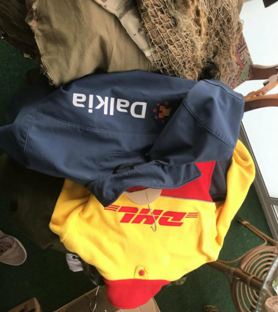 Arbetskläder tillhörande olika företag finns i samlingen av militärutrustning.