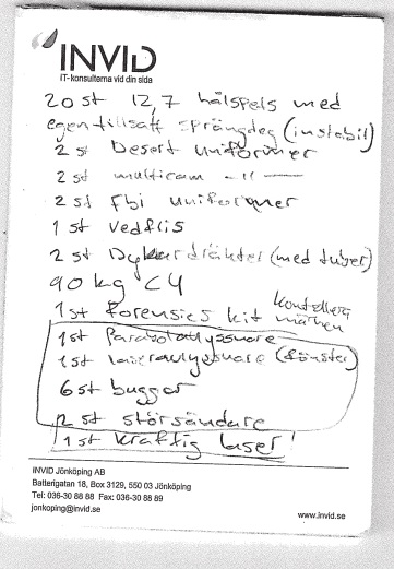 Någon form av planeringslista visar att man bland annat ska ha ”FBI-uniformer”, ”90 kilo C4” (sprängdeg), ”störsändare” och ”kraftig laser”.
