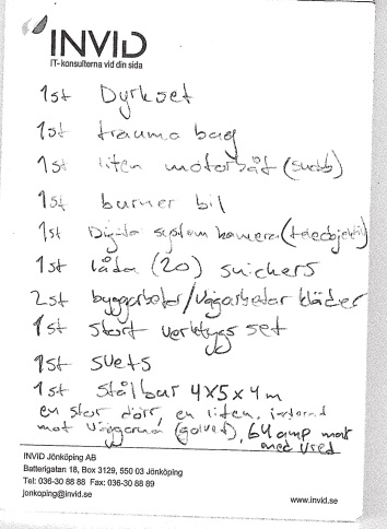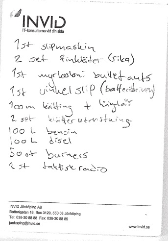 Här nämns ”2 set finkläder (rika)”. Bilden som polisen har fotat på balkongen över militärutrustningen visar två kostymer hängande bredvid packningen. En batteridriven vinkelslip samt ett stort antal ”burners”, ett slangord för telefoner som sedan förstörs och överges.