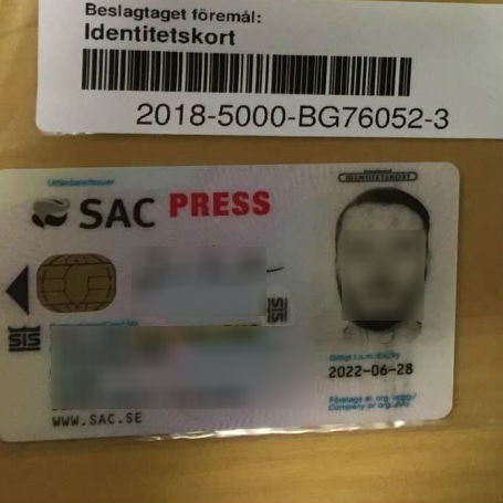 I lägenheten påträffar man även en presslegitimation utfärdad av SAC Syndikalisterna.
