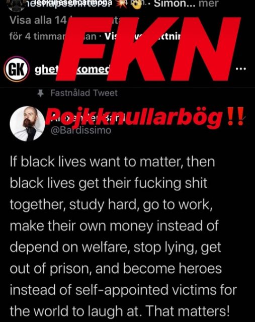 If black lives want to matter, then black lives get their fucking shit together, study hard, go to work, make their own money instead of depend on welfare, stop lying, get out of prison, and become heroes instead of self-appointed victims for the world to laugh at. That matters! — Alexander Bard (@Bardissimo) June 13, 2020